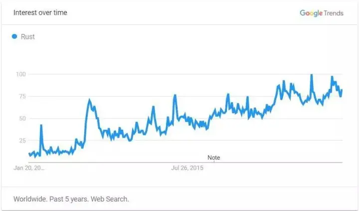Rust 由 Mozilla 赞助开发,连续两年在 StackOverflow 调查中被评为最受开发人员喜欢的语言。Rust 于 2010 年面世,虽然是一门非常新的语言,但已经获得广受关注,且有望在未来进一步发展。