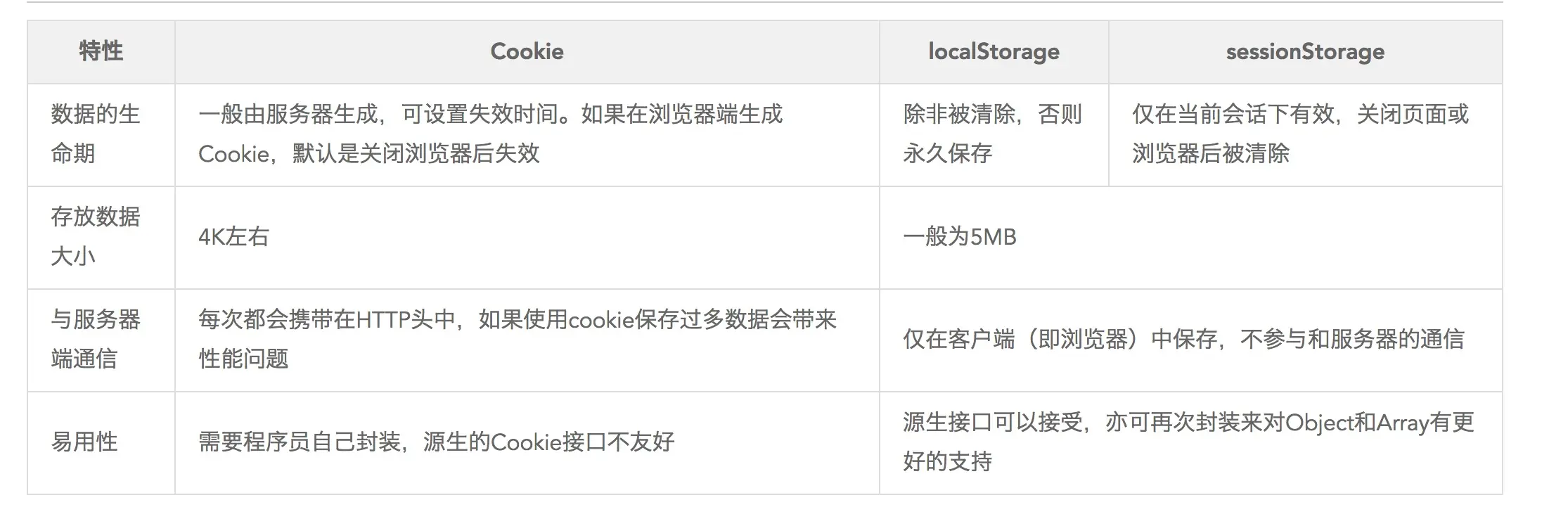 - 作用域区别:sessionStorage 不在不同的浏览器窗口中共享,即使是同一个页面; localStorage 和 cookie 在所有同源窗口是共享的