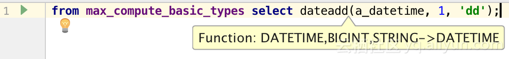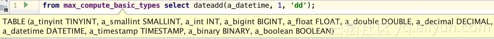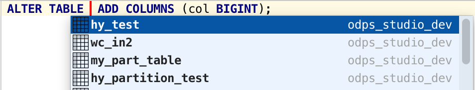 相信大家都有过忘记SQL怎么写的时候,一旦忘记,恐怕只能到处去找文档和代码示例,被迫离开全神贯注的SQL editor,十分影响效率。在studio中,我们集成了大量的MaxCompute SQL语法模板,你只需一个快捷键就能唤出,十分方便。譬如,我现在想要在表中加入一列,但不知道SQL语法,那么使用快捷键(Windows: Ctrl + J, Mac: ⌘ + J)唤出live template,输入column关键字搜索语法模板,这里我们选择alter table add column: