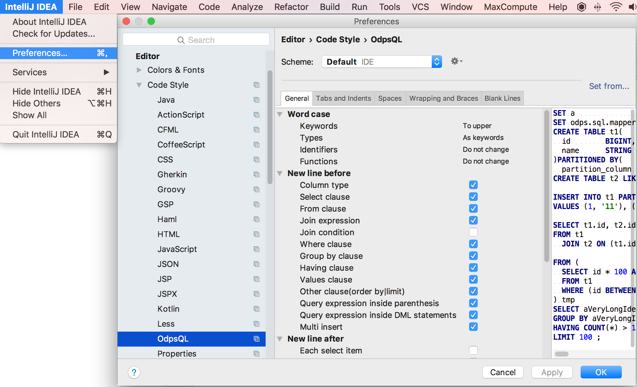 全部的规则列表可在Preference - Editor - Inspections - MaxCompute 处查看。