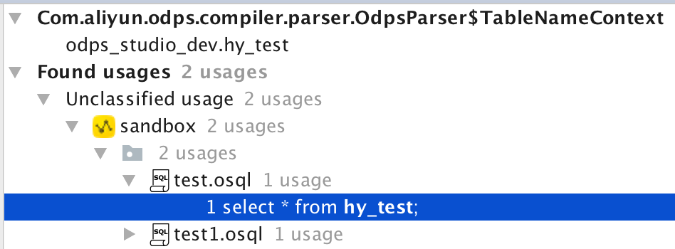 有时,我们想知道某张表(或函数)都在哪些脚本中使用,以便于我们更好的理解这张表的加工逻辑。那么,你可以在editor中选中表,右键菜单选 Find Usages,则会在当前IntelliJ project下搜索到所有使用该表的脚本: