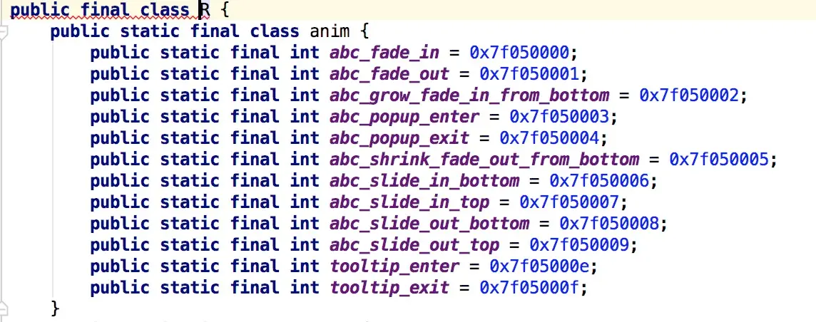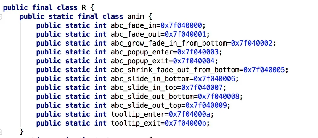 每个组件 module各自生成aar文件的时候,aapt会单独生成R.java文件,然后在app module中执行java compile命令编译class文件时会将常量变化成具体的值。