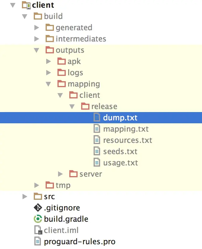 混淆之后为了根据出错的信息找回原本出错的地方可以到对应文件下找对应的文件:/build/outputs/mapping/client/release/
