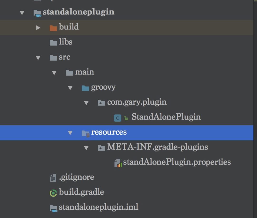 通过简单的id的方式,我们可以隐藏类名等细节,使的引用更加容易。映射方式很简单,在buildSrc目录下创建resources/META-INF/gradle-plugins/xxx.properties,这里的xxx也就是所映射的id,这里我们假设取名myplugin。具体结构可参考上文buildSrc目录结构。
