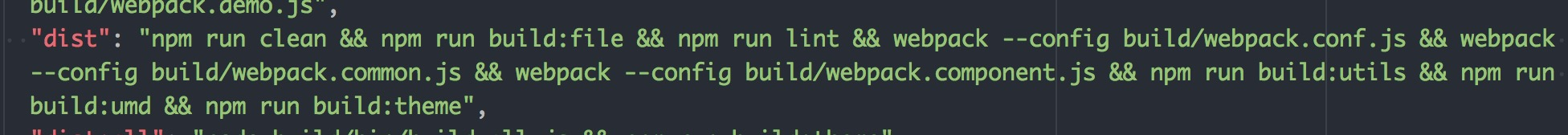 在Element的贡献指南里说了开发环境搭建和打包代码的指令。打包代码用 npm run dist ,我们去package.json中可以看到这个指令具体的操作。