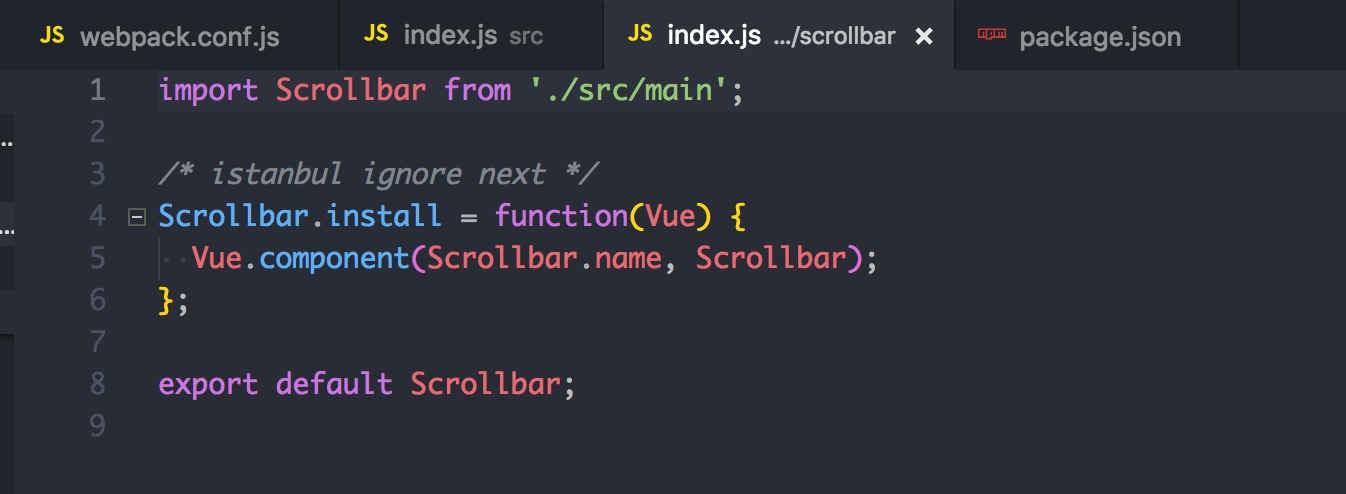 我们简单看一下build/webpack.conf.js这个文件,会发现打包的文件入口是./src/index.js,我们再去看一下这个文件。里面内容除了包含给vue安装插件,原型上挂载对象之类的操作外,就是用插件的方式把Element组件给注册完成,当然也暴露出用安装包方式安装后要用的所有方法和属性。其实我们已经看到了Scrollbar的身影。再循着去看一下packages/scrollbar/index.js'这个文件,简单的把这个组件引入后,添加了一个install方法,提供给Vue的use方法使用,然后就直接export出来了。