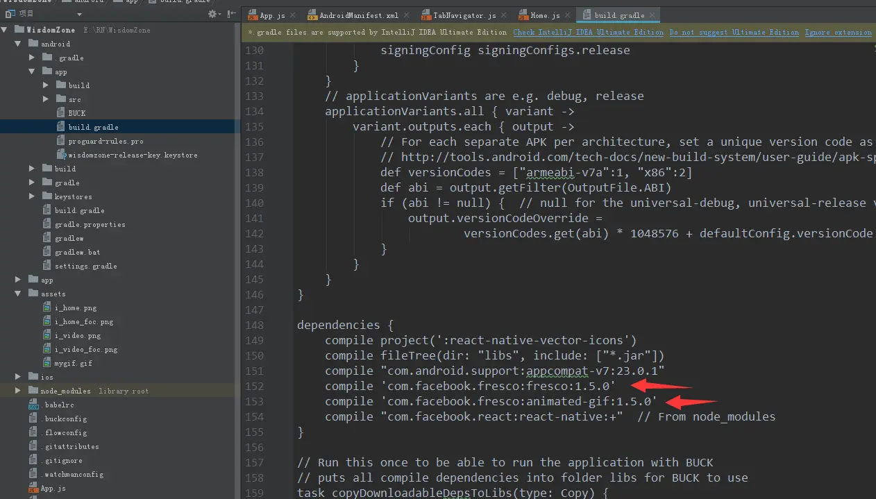 ReactNative 添加Android对GIF图片的支持 深夜冷冷 2018-05-29 269 阅读1分钟 打开项目根目录下的 /android/app/build.gradle 文件 在dependencies里增加两行代码: compile 'com.facebook.fresco:fresco:1.5.0' compile 'com.facebook.fresco:animated-gif:1.5.0' 然后重启项目就行了。