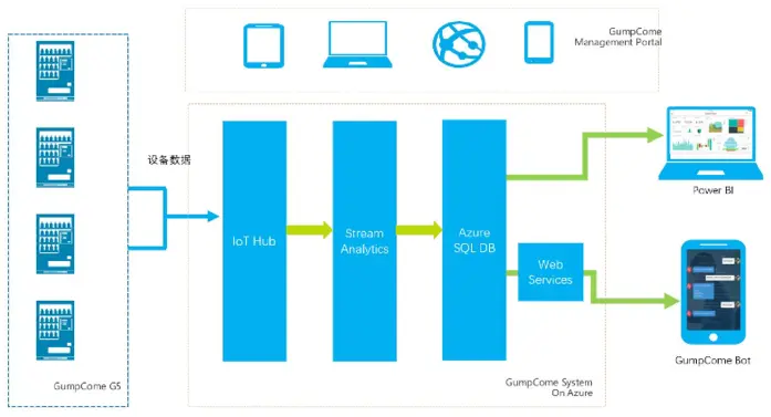 通过Azure IoT 中心,甘来可轻松安全地连接到货柜,使用设备到云的遥测数据,了解设备和货品的状态,在设备需要关注时立即采取措施。在云到设备消息中,可靠地向连接的设备发送命令和通知,并通过确认回执跟踪消息传递。通过持久的方法发送设备消息,以适应间歇性连接的设备。通过该服务,甘来可以使用业界标准协议(如 AMQP、MQTT、HTTP)或自定义的TCP协议,与智能售货机建立连接,并为每个设备设置标识和凭据,确保智能设备与后端云服务之间的消息传输安全保密,实现对庞大智能售货机资产的全面管理,并减轻资源消耗。对于我们这样云使用量较大的企业来说,Azure IoT能够大大减少Azure的用量,好比 “从20公斤负重的登山装,变成一个电脑双肩包的感觉”。管理员可在云端大规模地远程维护、更新和管理 IoT 设备。免除自定义设备管理解决方案的开发和维护任务,或者无需再花费资源维护全球资产,从而节省了时间和成本。