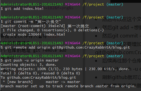 第一次提交要增加一个将要提交到的那个仓库的地址 git remote add origin git@github.com:CrazyRabbitA/blog.git