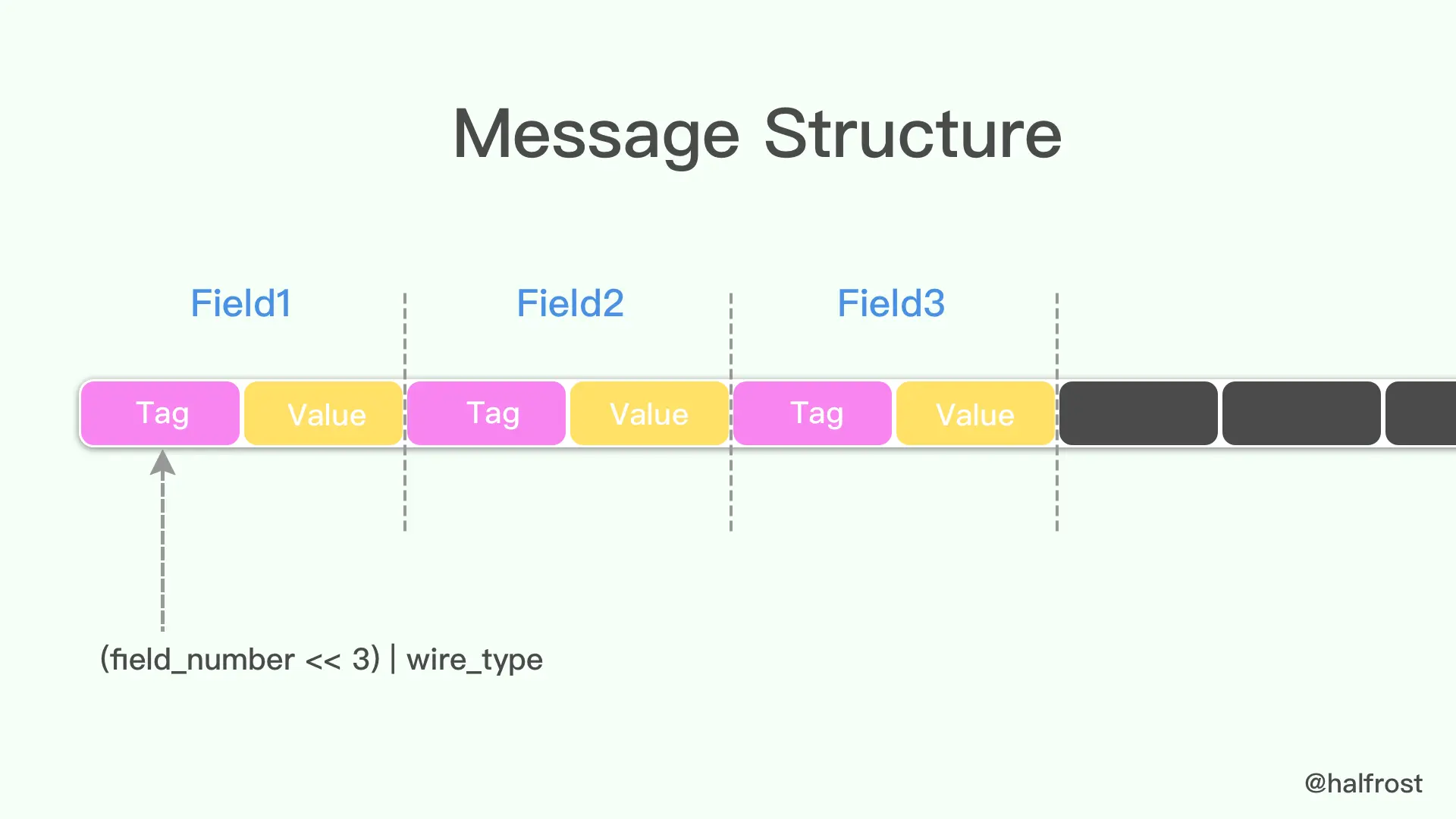 12 -> 0001 0010,后三位 010 为 wire type = 2,0001 0010 右移三位为 0000 0010,即 tag = 2。