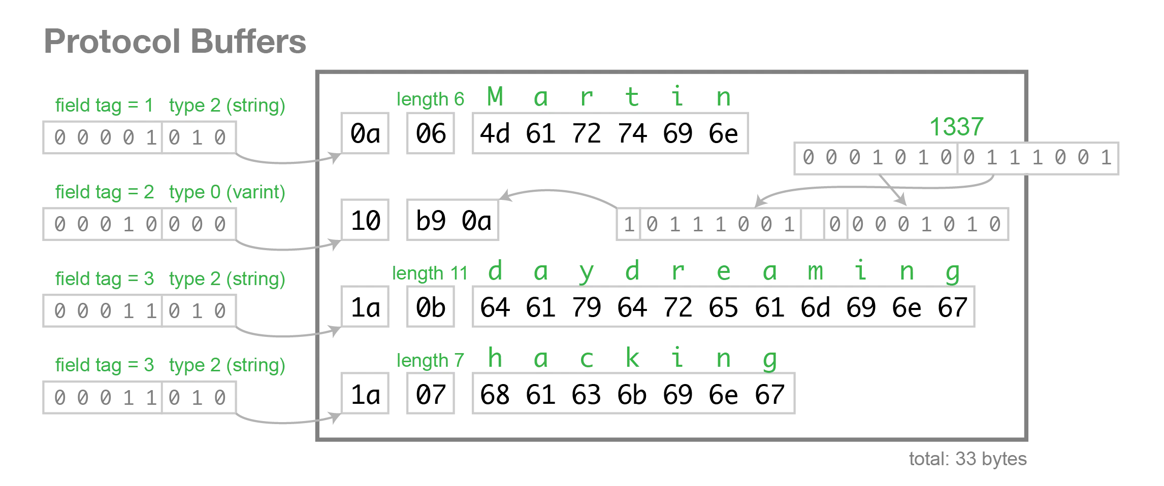 从那时起,名为“缓冲”的部分已经失去了意义,但它仍然是我们使用的名称。今天,人们通常使用术语“protocol message”来指代抽象意义上的消息,“protocol buffer”指的是消息的序列化副本,而“protocol message object”指的是代表内存中对象解析的消息。