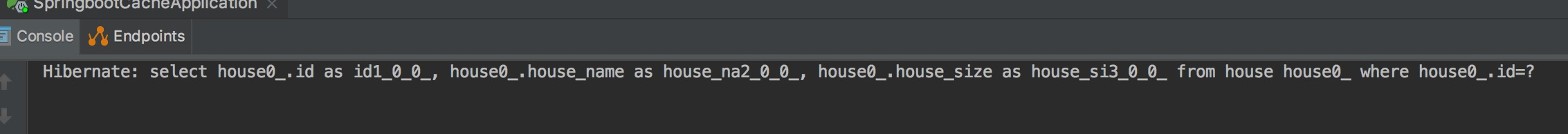 3.调用清空缓存方法http://localhost:8888/deleteCache然后在次访问查询方法http://localhost:8888/queryHouse?id=1,查看控制台如下,可以到清空缓存后,在访问就需要查询数据库。