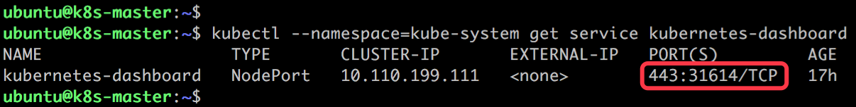 因为 Service 是 ClusterIP 类型,为了方便使用,我们可通过 kubectl --namespace=kube-system edit service kubernetes-dashboard 修改成 NodePort 类型。