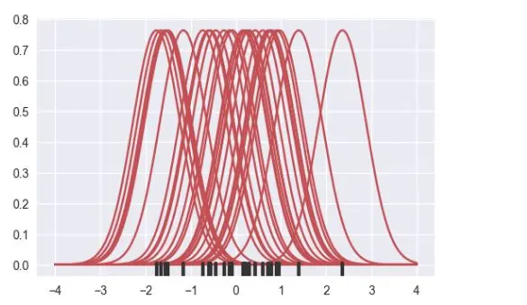然后,这些替代的曲线进行加和,并计算出在每个点的密度值。最终生成的曲线被归一化,以使得曲线下面包围的面积是1。