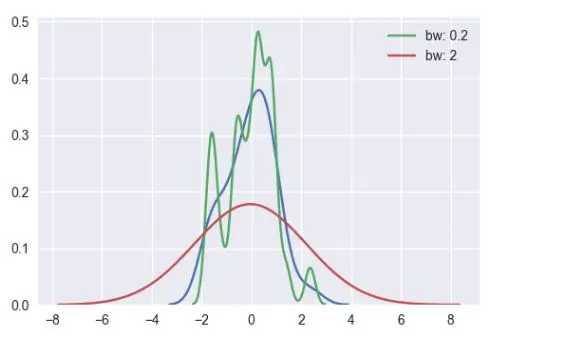 KDE 的带宽参数(bw)控制着密度估计曲线的宽窄形状,有点类似直方图中的 bins 参数的作用。它对应着我们上面绘制的 KDE 的宽度。默认情况下,函数会按照一个通用的参考规则来估算出一个合适的值,但是尝试更大或者更小也可能会有帮助: