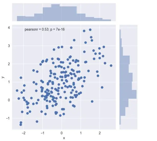 对于双变量分布的可视化也是非常有用的。在 seaborn 中最简单的方法就是使用 joinplot() 函数,它能够创建一个多面板图形来展示两个变量之间的联合关系,以及每个轴上单变量的分布情况。