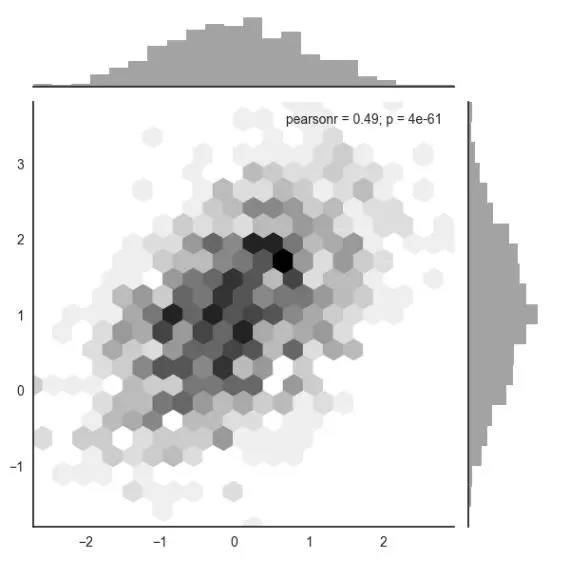 直方图 histogram 的双变量类似图被称为 “hexbin” 图,因为它展示了落在六角形箱内的观测量。这种绘图对于相对大的数据集效果最好。它可以通过 matplotlib 的 plt.hexbin 函数使用,也可以作为 jointplot 的一种类型参数使用。它使用白色背景的时候视觉效果最好。