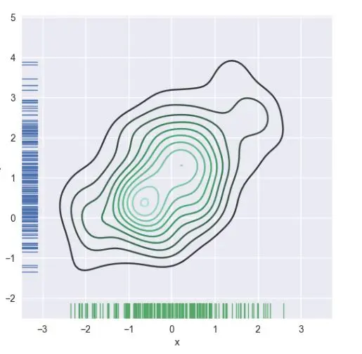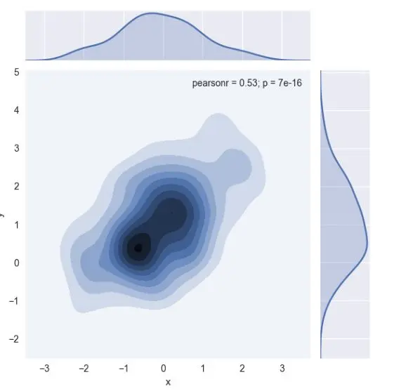 还使用上面描述的核密度估计过程来可视化双变量分布。在 seaborn 中,这种绘图以等高线图展示,并且可以作为 jointplot()的一种类型参数使用。