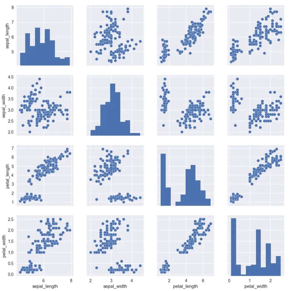 为了绘制数据集中多个成对的双变量,你可以使用 pairplot() 函数。这创建了一个轴矩阵,并展示了在一个 DataFrame 中每对列的关系。默认情况下,它也绘制每个变量在对角轴上的单变量。