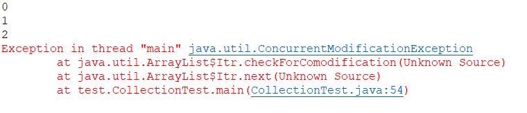 **结果分析:**因为当temp==3的时候,执行list.remove()方法,集合的结构被改变了,所以再次遍历迭代器的时候,就会抛出异常。