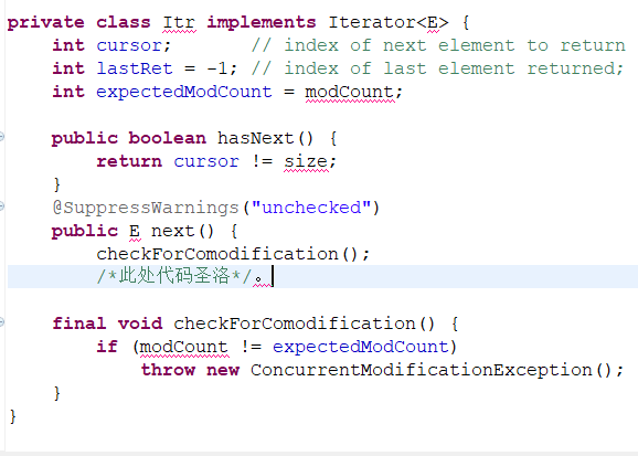 expectedModcount:这个值在对象被创建的时候就被赋予了一个固定的值modCount。也就是说这个值是不变的。也就是说,如果在迭代器遍历元素的时候,如果modCount这个值发生了改变,那么再次遍历时就会抛出异常。