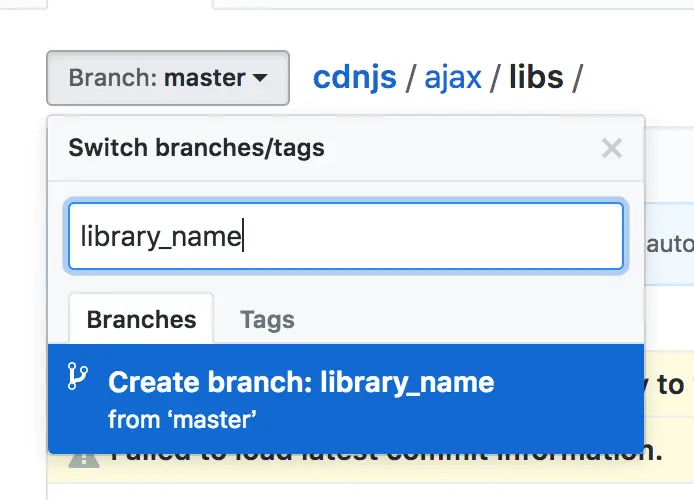点击Branch: master下拉框,输入你要添加的library的名字,点击 “Create branch <LIBRARY_NAME> from master” 按钮。创建分支