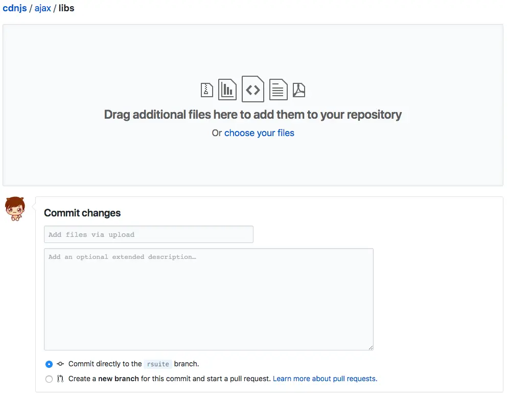 直接在你的仓库页面打开ajax/libs路径,将你的文件夹拖进去就好了。(文档说点击 Upload File按钮,然而并没有找到啊。)
