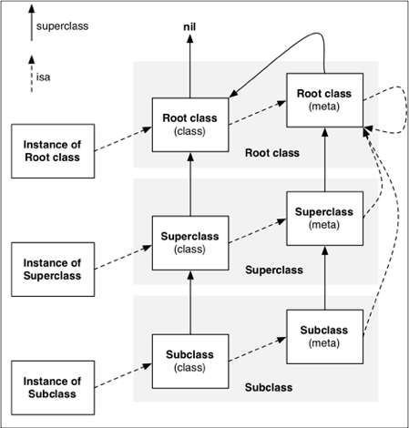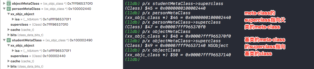 上图中通过地址证明meta-class的superclass指向父类的meta-class,基类的meta-class的superclass指向基类的class类。