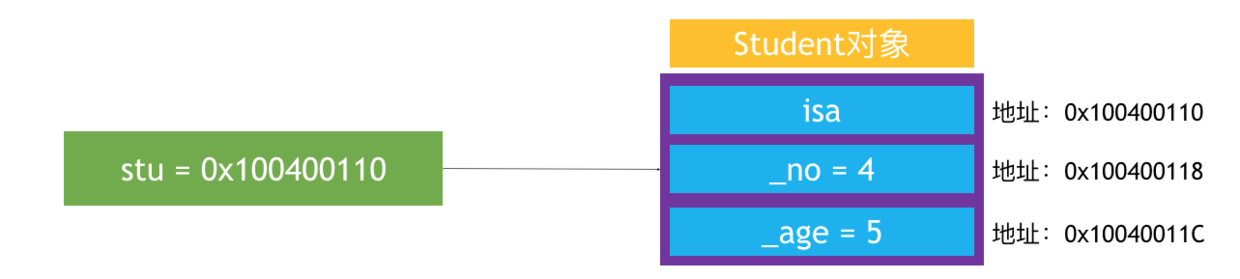 sutdent对象的3个变量分别有自己的地址。而stu指向isa指针的地址。因此stu的地址为0x100400110,stu对象在内存中占用16个字节的空间。并且经过赋值,_no里面存储着4 ,_age里面存储着5