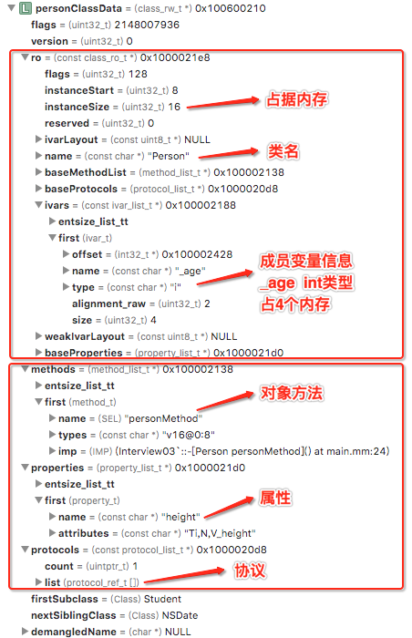 而上图中的instaceSize = 16也同person对象中isa指针8个字节+_age4个字节+_height4个字节相对应起来。这里不在展开对objectClassData及studentClassData进行分析,基本内容同personClassData相同。