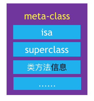 最后我们来看meta-class元类对象,上文提到meta-class中存储着isa指针,superclass指针,以及类的类方法信息。同时我们知道meta-class元类对象与class类对象,具有相同的结构,只不过存储的信息不同,并且元类对象的isa指针指向基类的元类对象,基类的元类对象的isa指针指向自己。元类对象的superclass指针指向其父类的元类对象,基类的元类对象的superclass指针指向其类对象。