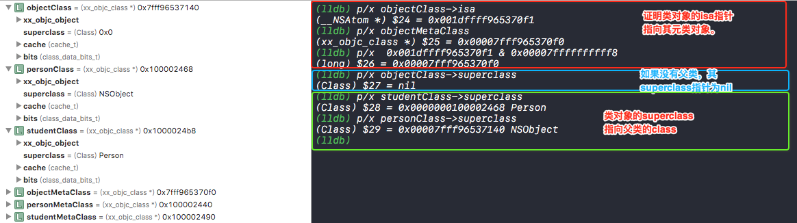 通过上图中的内存地址的分析,由此我们证明isa,superclass指向图中,isa指针的4,5,6号线,以及superclass指针的10,11,12号线。