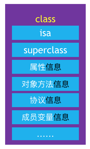 - class类对象:类对象内存存储的信息:isa和superclass指针、类的属性信息和成员变量、对象方法和协议信息