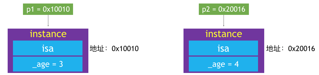 因此此结构体占用多少存储空间,对象就占用多少存储空间。因此结构体占用的存储空间为,isa指针8个字节空间+int类型_no4个字节空间+int类型_age4个字节空间共16个字节空间