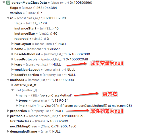 首先我们可以看到结构同personClassData相同,并且成员变量及属性列表等信息为空,而methods中存储着类方法personClassMethod。