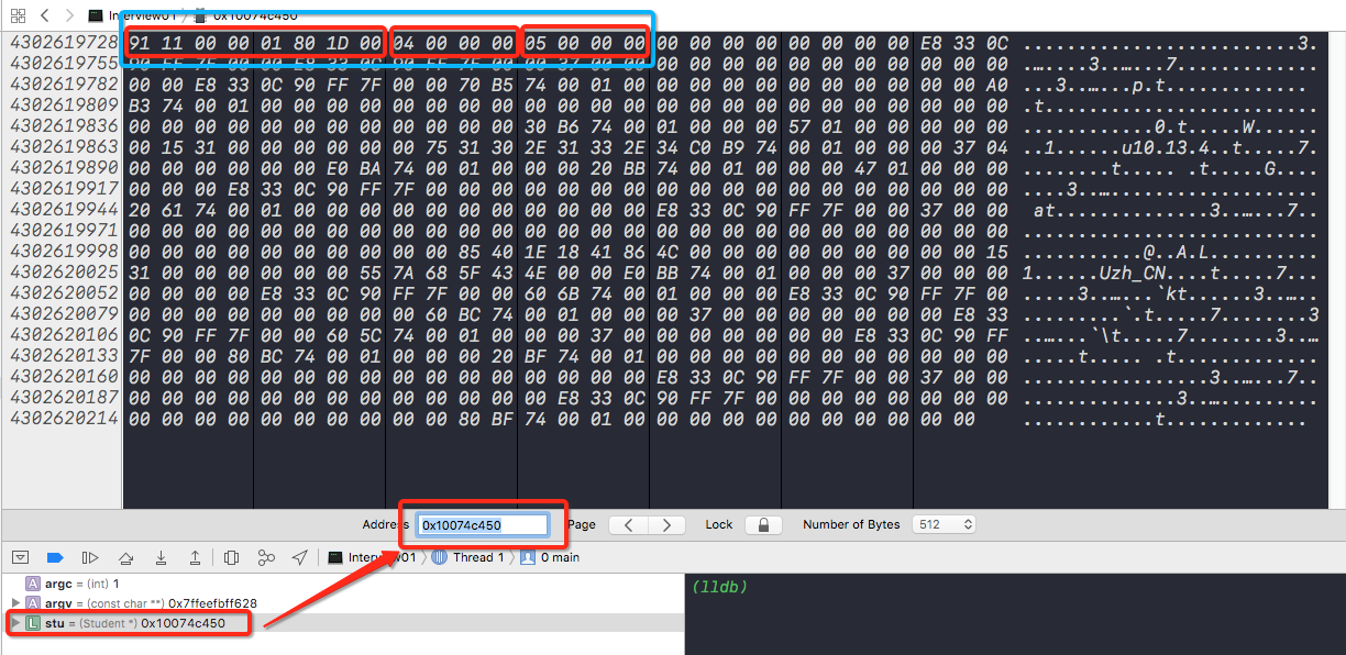 方式一:通过打断点。 Debug Workflow -> viewMemory address中输入stu的地址