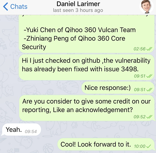2018-5-29 Vendor Fixed the Vulnerability on Github and Closed the Issue