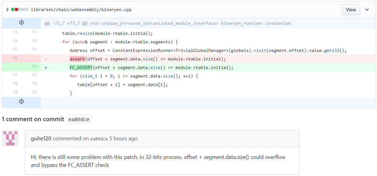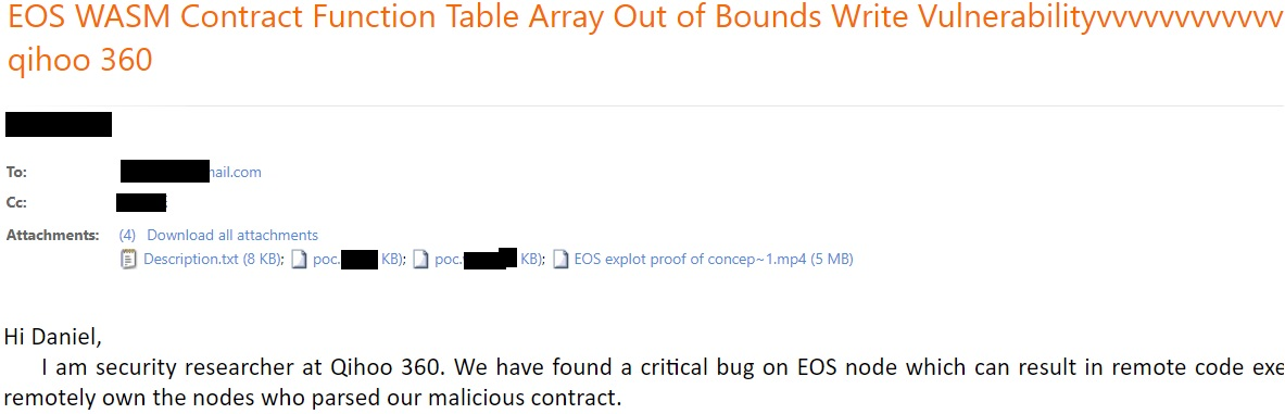 We found and successfully exploit a buffer out-of-bounds write vulnerability in EOS when parsing a WASM file.