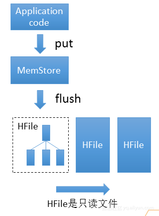Bulkload使用的是一种新的结构LSM Tree进行写入更新,其结构如上图所示。使用Application code 进行数据写入,数据会被写入到MemStore,MemStore在HBase里是一个跳表,可以把它看成一个有序的列表,并不断往里面插入数据。当数据达到一定量时就会启动flush对数据进行编码和压缩,并写成HFile。HFile是由索引块和数据块组成的文件结构,其特点是只读性,生成HFile之后就不可改了。当用户进行读取数据的时候,就会从三个HFile和一个MemStore进行查找进行读取。这个结构的优化就是就把随机的写变成了有序的写。Bulkload就可以把上千上万条数据在毫秒内加入到HBase里。所以Bulkload的优势如下: