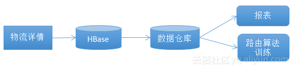 菜鸟联盟的场景如上图所示。一个物流详情会传到HBase,HBase会传到数据仓库,数据仓会产生报表,然后去训练路由算法。