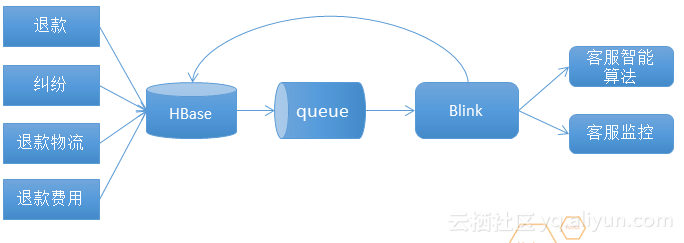 淘宝客服的一个退款应用场景如上图。这是一个逆向链接,把退款、纠纷、退款物流、退款费用等实时的写入到HBase里,HBase会实时的写入queue里,blink流系统会消费queue产生一些数据会返回到HBase,blink输出会支撑智能服务、客户监控等。