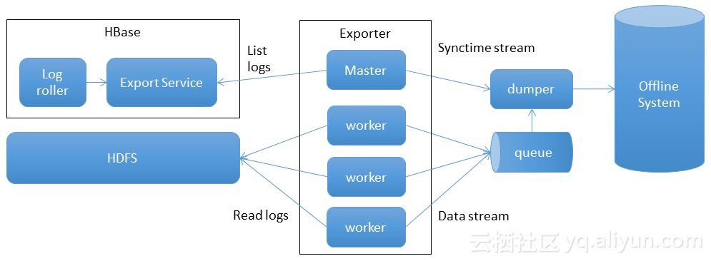 HExporter1.0的问题是业务写入流量产生高峰,离线出现同步延迟;HBase升级速度慢。然后我们就有了以下解决思路,离线同步的资源可以和在线资源隔离,利用离线大池子可以削峰填谷;Exporter的worker是无状态的,如果把所有逻辑都放在Exporter,那么升级、扩容会简单快速。然后就产生了HExporter2.0。