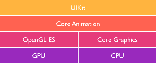 为了了解性能如何受到影响,我们需要仔细研究iOS中图形框架背后的技术堆栈。这个方框图代表了不同的frameworks和libraries,以及它们是如何相互关联的: