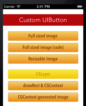 drawRect方法依赖于Core Graphics去绘制,但它的主要缺点在于它处理触摸事件的方式。每次button出发点击事件时setNeedsDisplay会重新绘制,不止一次,但是每一次敲击两次。这不是CPU和内存的良好使用,特别是如果在接口中有多个UIButton实例。
