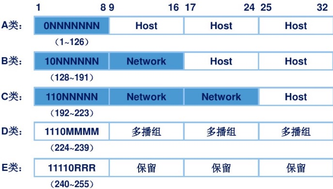 将ip地址中的网络位和主机位固定下来后,ip地址被分成了不同的积累:A类,B类,C类,D类,E类