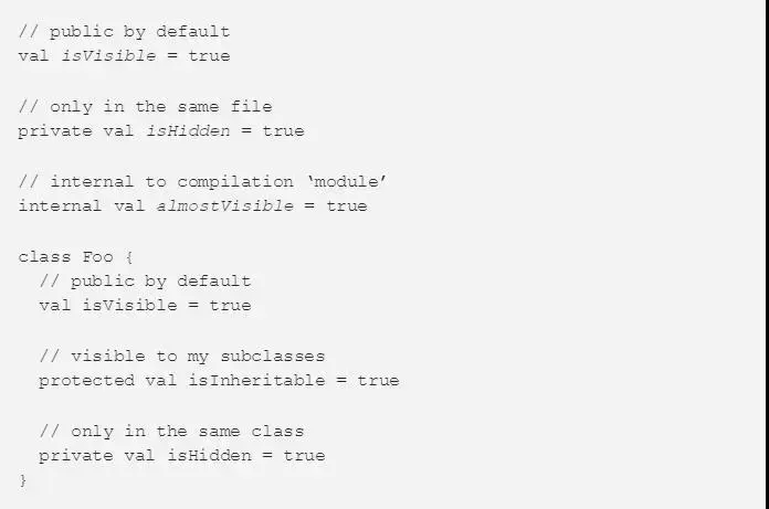 在 Kotlin 中一切都是默认 public 的。并且 Kotlin 还有一套丰富的可见性修饰符,例如:private, protected, internal。它们每个都以不同的方式降低了可见性。