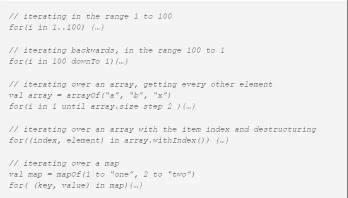 for 循环在与其他两种 Kotlin 特性一起使用时可以获得超级能力:范围表达式和解构。