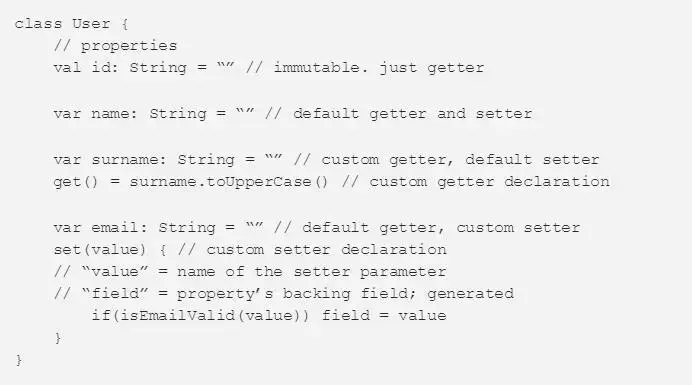 在 Kotlin 中,类可以具有可变和只读属性,默认情况下生成 getter 和 setter。如果需要,您也可以实现自定义的。