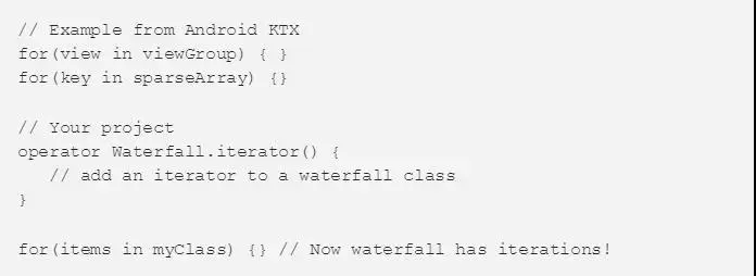 迭代器用在了有趣的地方!Android KTX 将迭代器添加到 viewGroup 和 sparseArray。要定义迭代器扩展请使用 operator 关键字。 Foreach 循环将使用扩展名!