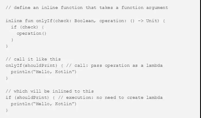 等不及要使用 lambdas 来生成一个新的接口?kotlin 可以使您制定一个 inline 的方法 -- 这意味着调用将替换方法体,用很非常简单的方法来生成 lambda 的接口。
